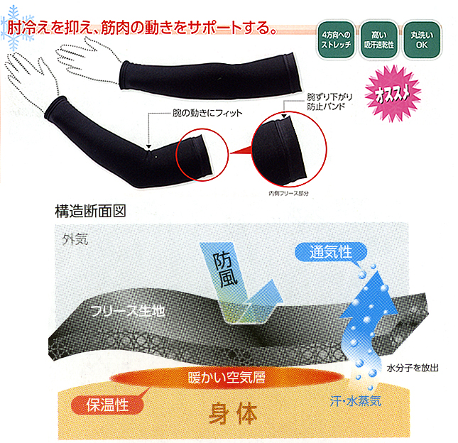 - 肌触りの良い、腕ずり下がり防止バンドを使用しています。